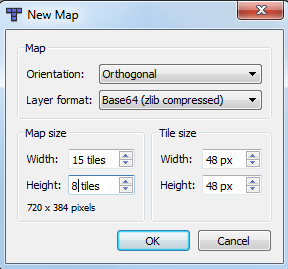 Set the width to be 15 and the height to be 8 tiles. The individual tile size should be 48 by 48 px. The orientation should remain “Orthogonal” and the Layer format should be “Base64 (zlib compressed)”.