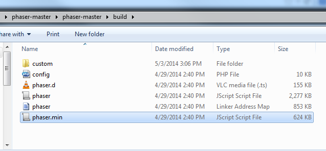 Select the “phaser.min.js” file and, using either the Ctrl-C keyboard shortcut or from the right-click context menu, copy the file.