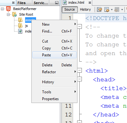 Within NetBeans, right-click on the “js” folder within the Projects view. Select “Paste” to move a copy of the library into the project.
