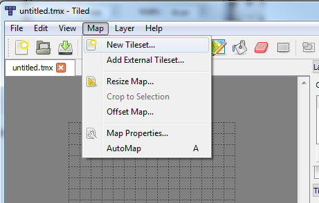 Once the empty map has been created, go to the Map from the top-level menu and select “New Tileset…”